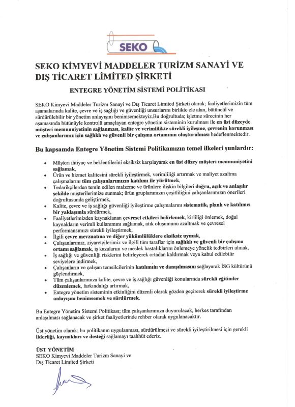 SEKO KİMYA olarak misyonumuz; yüksek kalite standartlarında ürün ve hizmet sunarak, müşteri memnuniyetini her şeyin üzerinde tutmak ve iş ortaklarımıza katma değer sağlamaktır. Bu doğrultuda, sürekli gelişen AR-GE çalışmalarımız, mühendislik destekli uygulamalarımız ve güçlü servis altyapımız ile müşterilerimizin değişen ihtiyaçlarına hızlı ve etkin çözümler üretmekteyiz.